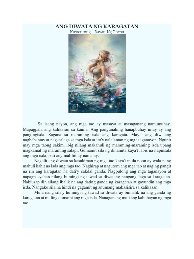 Sa sandaling siya'y lumaban kay titans laban sa mga mas batang mga diyos. Ngunit siya ang kalooban, walang tutol, nakatanggap ng kapatawaran at kapayapaan ay nagdadala ng waves. Ang diwata ng karagatan kuwentong bayan ng ilocos. Sa isang nayon ang mga tao ay masaya at masaganang namumuhay. Sagana sa maraming isda ang karagata. Gumamit ng dinamita sa pangingisda upang magkaroon ng maraming ani at. Tamang sagot sa tanong. Ang diwata ng karagatan ang pangunahing karakter dito ay ang mismong diwata ng karagatan. Ang iba pang mga tauhan ay ang mga mamamayan na nabubuhay sa pangingisda.