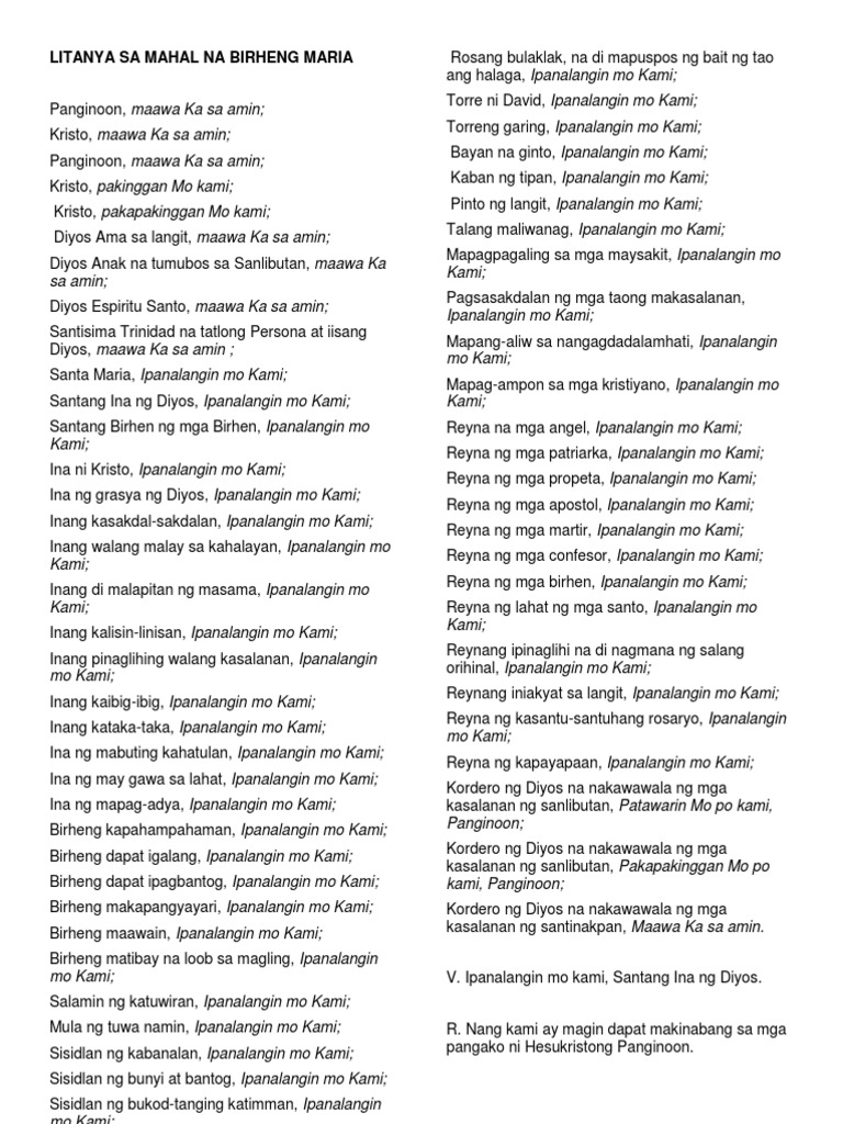 The barangay sang birhen, the sodality of our lady, the legion of mary, the association of the children of mary immaculate, are also fruits of the same devotion and have contributed in their own way to the development of christian life in the archipelago. An element that often escapes the superficial observer is the deep religious meaning that some of these practices,. Litanya sa mahal na birhen maria panginoon, maawa ka sa amin, kristo, maawa ka sa amin, panginoon, maawa ka sa amin, kristo, pakinggan mo kami,. Sections of this page.